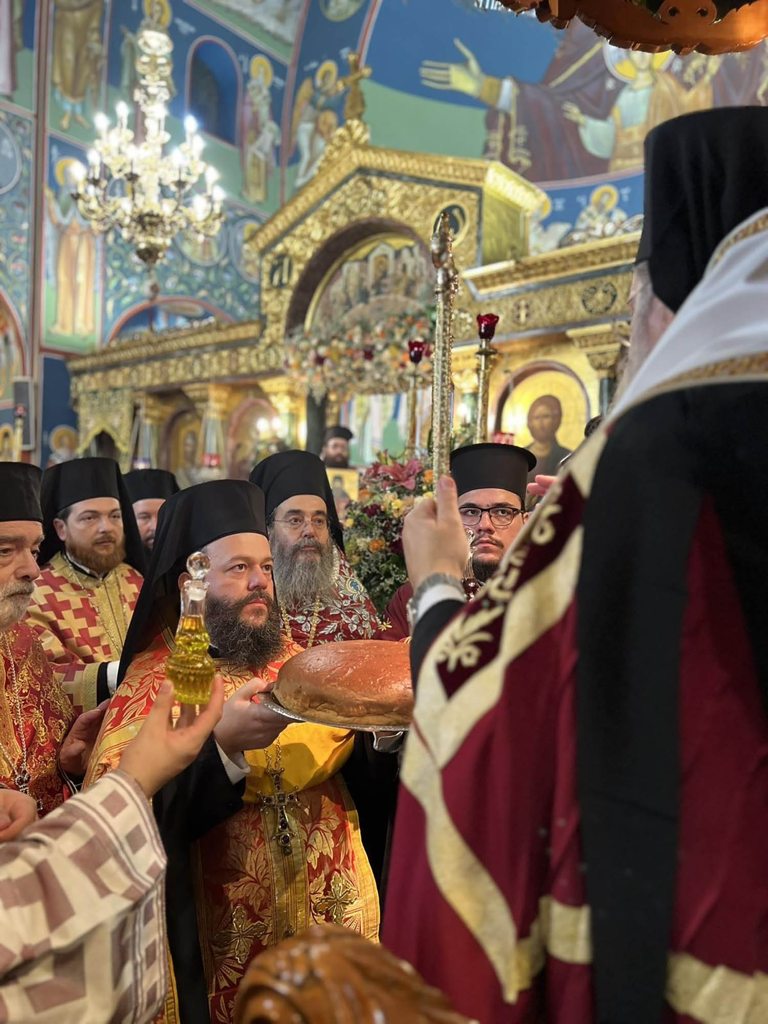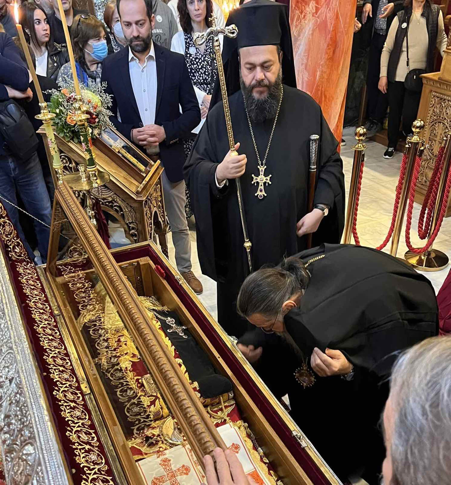 Νωρίτερα, στο πλαίσιο του εορτασμού του Πολιούχου της Ιεράς Μητροπόλεως, πραγματοποιήθηκε στα προπύλαια του Ιερού Ναού λαμπρή υποδοχή τεμαχίου Τιμίου Ξύλου, το οποίο στη συνέχεια τέθηκε σε προσκύνηση προς ευλογία και αγιασμό του πιστού λαού.