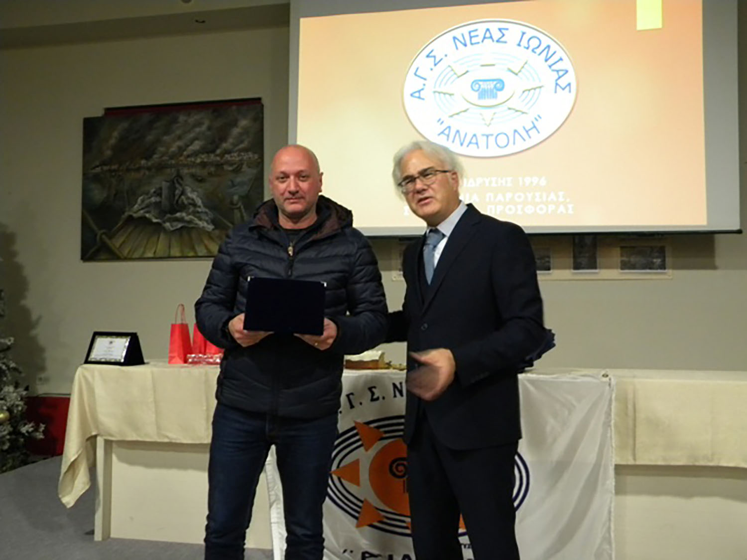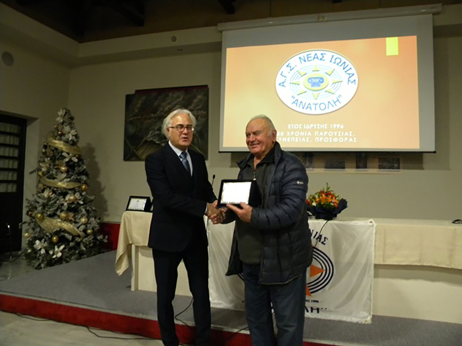 Το Δ.Σ. αποφάσισε και βράβευσε αυτή τη χρονιά τον παλαιό πρωταθλητή του άλματος σε μήκος κ. Σπύρο Βασδέκη, για τις επί σειρά ετών πρώτες νίκες του. Την απονομή της τιμητικής πλακέτας έκανε ό τέως Δήμαρχος κ. Πέτρος Μπουρδούκος, ο οποίος υπενθύμισε ότι επί της δικής του θητείας το 1996, ιδρύθηκε η ΑΝΑΤΟΛΗ. Ο κ. Μπουρδούκος έκοψε και ένα κομμάτι Πίτας εκφράζοντας τις ευχές του για πολλά ακόμη χρόνια ζωής του Συλλόγου.