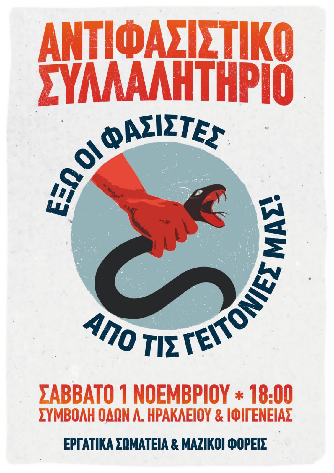 Σας καλούμε σε αντιφασιστική συγκέντρωση το Σάββατο 1 Νοεμβρίου στις 6 μ.μ. στη συμβολή των οδών Λ. Ηρακλείου και Ιφιγενείας για να καταδικάσουμε τα φασιστικά μορφώματα και το εκμεταλλευτικό σύστημα που τα γεννά και τα θρέφει.