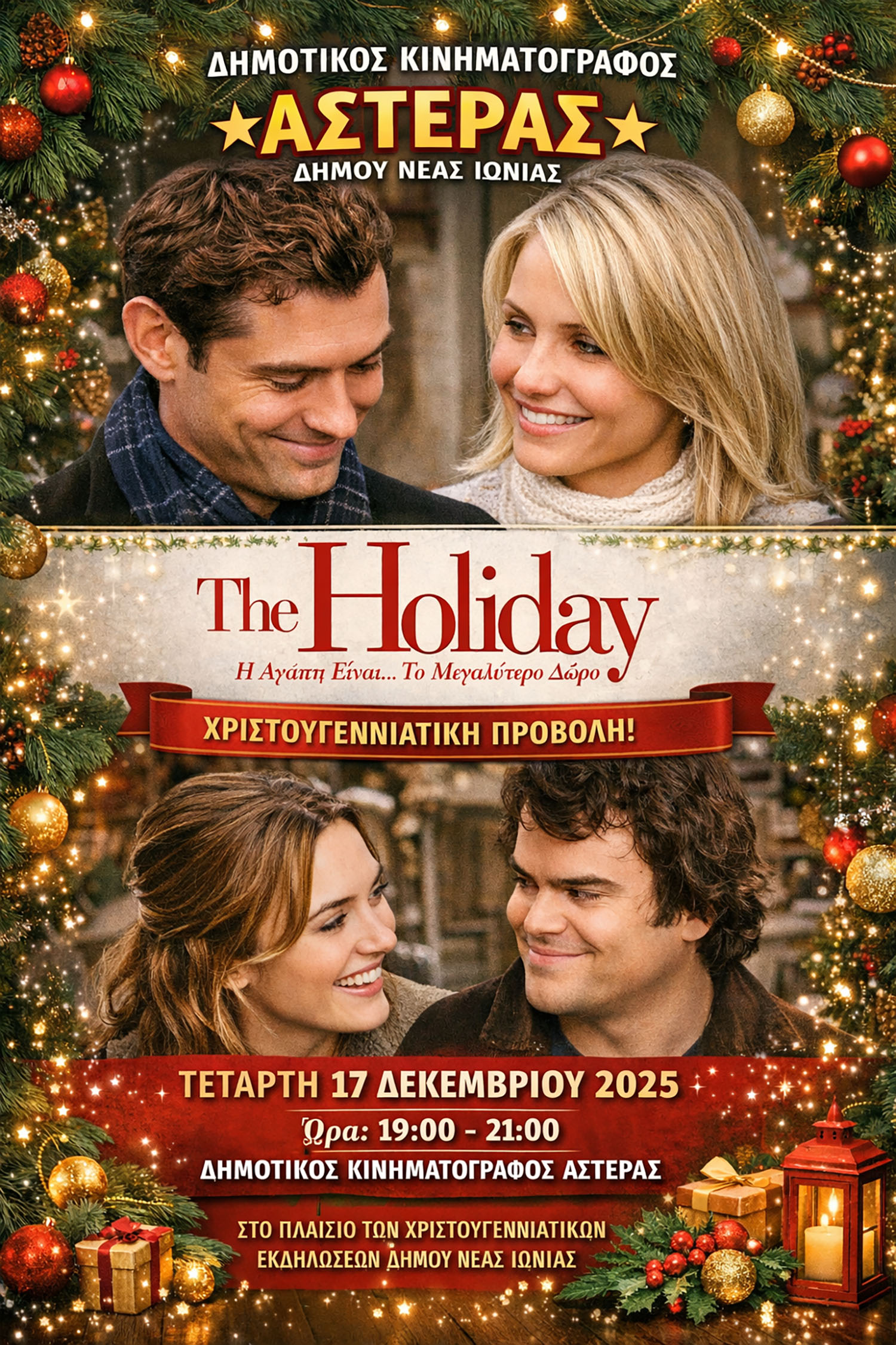 Η ταινία The Holiday προβάλλεται στον Δημοτικό Κινηματογράφο «Αστέρας» την Τετάρτη 17 Δεκεμβρίου 2025 και ώρα 19:00 – 21:00 , στο πλαίσιο των χριστουγεννιάτικων εκδηλώσεων του Δήμου Νέας Ιωνίας.