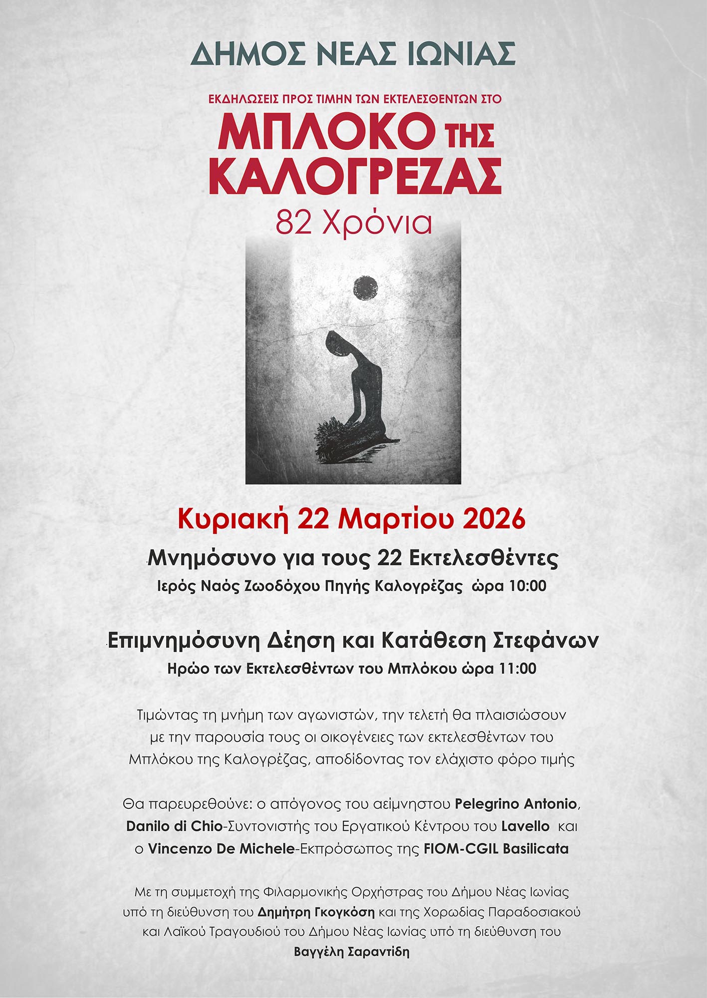 Επιμνημόσυνη Δέηση και Κατάθεση Στεφάνων από τους συγγενείς των εκτελεσθέντων και τοπικούς φορείς – ώρα 11:00, στο Ηρώο των Εκτελεσθέντων του Μπλόκου, με τη συμμετοχή της Φιλαρμονικής Ορχήστρας του Δήμου Νέας Ιωνίας υπό τη διεύθυνση του Δημήτρη Γκογκόση και της Χορωδίας Παραδοσιακού και Λαϊκού Τραγουδιού του Δήμου Νέας Ιωνίας υπό τη διεύθυνση του Βαγγέλη Σαραντίδη