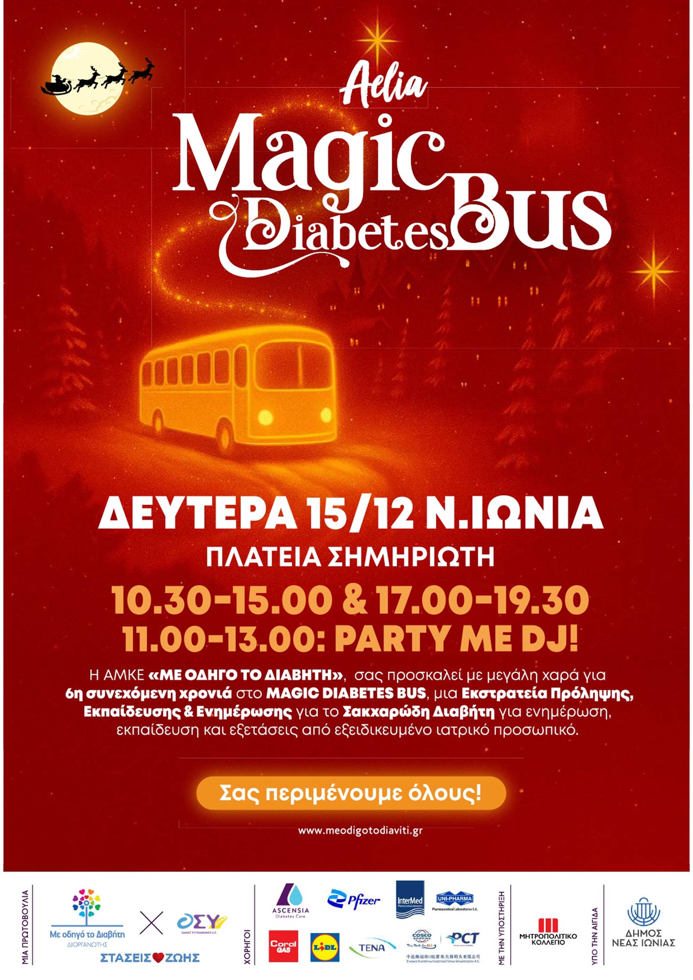 Η ΑΜΚΕ ” Με Οδηγό το Διαβήτη ” σε συνεργασία με τον Δήμο Νέας Ιωνίας διοργανώνουν και φέτος τη δράση MAGIC DIABETES BUS, που θα πραγματοποιηθεί στις 15 Δεκεμβρίου στη Πλατεία Σημηριώτη, από 10.30 π.μ – 2.00 μ.μ, και από 5.00μ.μ – 7.30μ.μ , συγχρόνως θα γίνει και PARTY με DJ από τις 11.00πμ-1.00μμ!