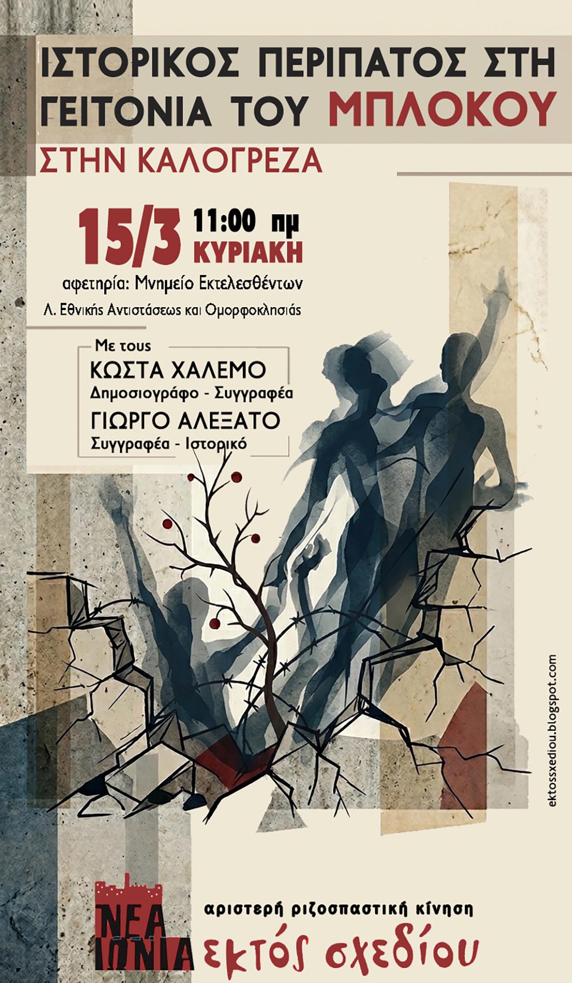 Σας καλούμε την Κυριακή 15 Μαρτίου, στις 11:00 π.μ., σε ιστορική περιήγηση στα βασικά σημεία του Μπλόκου της Καλογρέζας, με οδηγούς τον Κώστα Χαλέμο, συγγραφέα-δημοσιογράφο, και τον Γιώργο Αλεξάτο, συγγραφέα-ιστορικό.