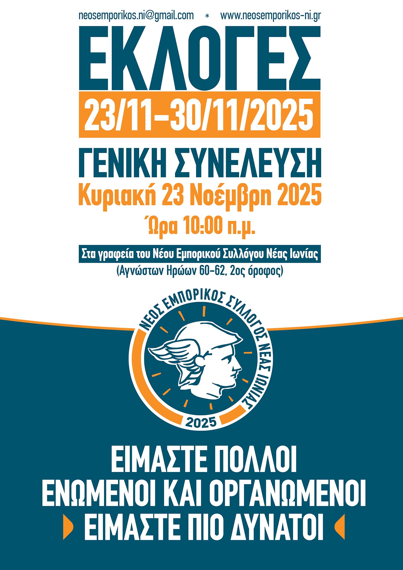 Καλούμε σε ΓΕΝΙΚΗ ΣΥΝΕΛΕΥΣΗ την Κυριακή 23 Νοέμβρη 2025 – Ώρα 10:00 π.μ., στα γραφεία του Νέου Εμπορικού Συλλόγου Νέας Ιωνίας (Αγνώστων Ηρώων 60-62, 2ος όροφος)