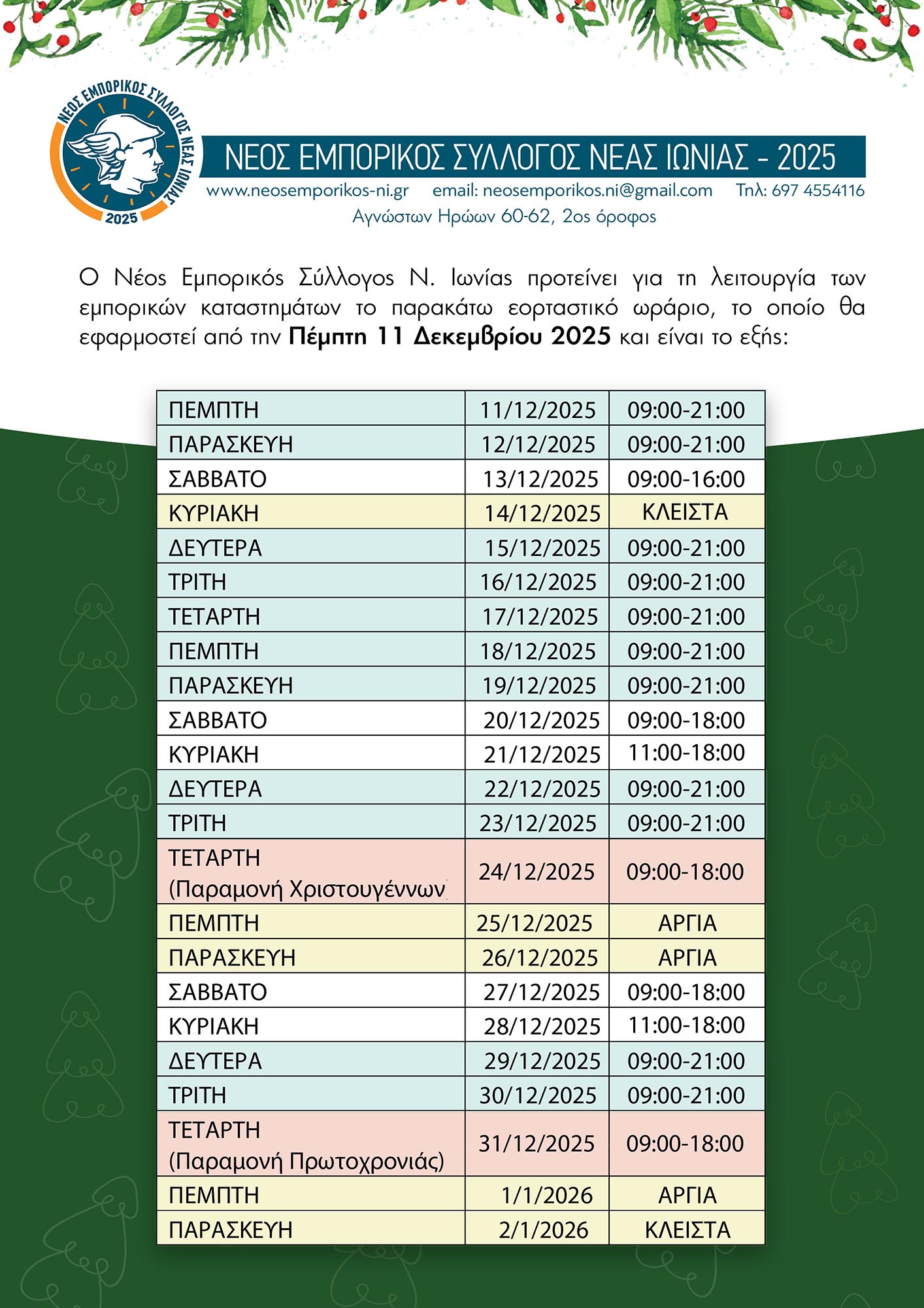 Ο Νέος Εμπορικός Σύλλογος Ν. Ιωνίας προτείνει για τη λειτουργία των εμπορικών καταστημάτων το παρακάτω εορταστικό ωράριο, το οποίο θα εφαρμοστεί από την Πέμπτη 11 Δεκεμβρίου 2025.