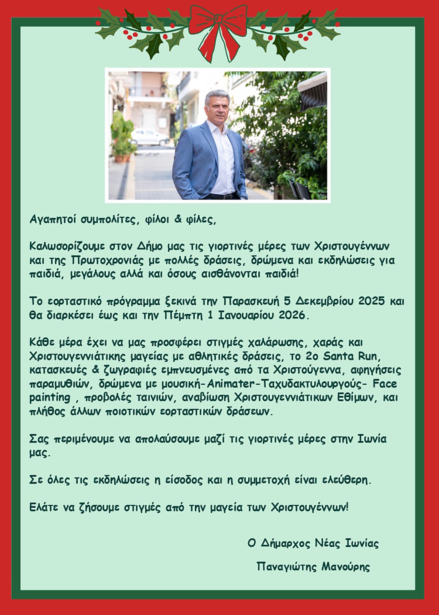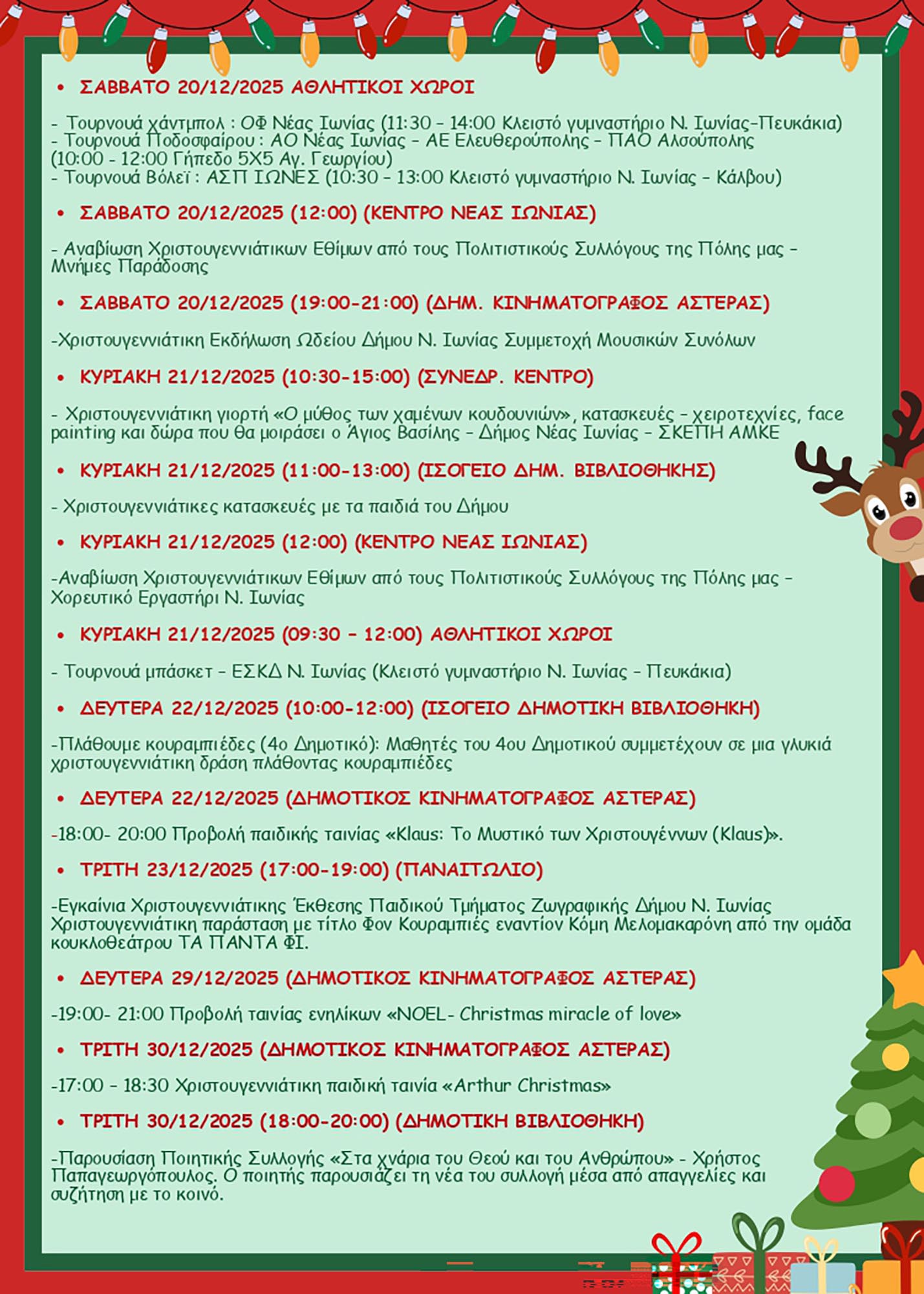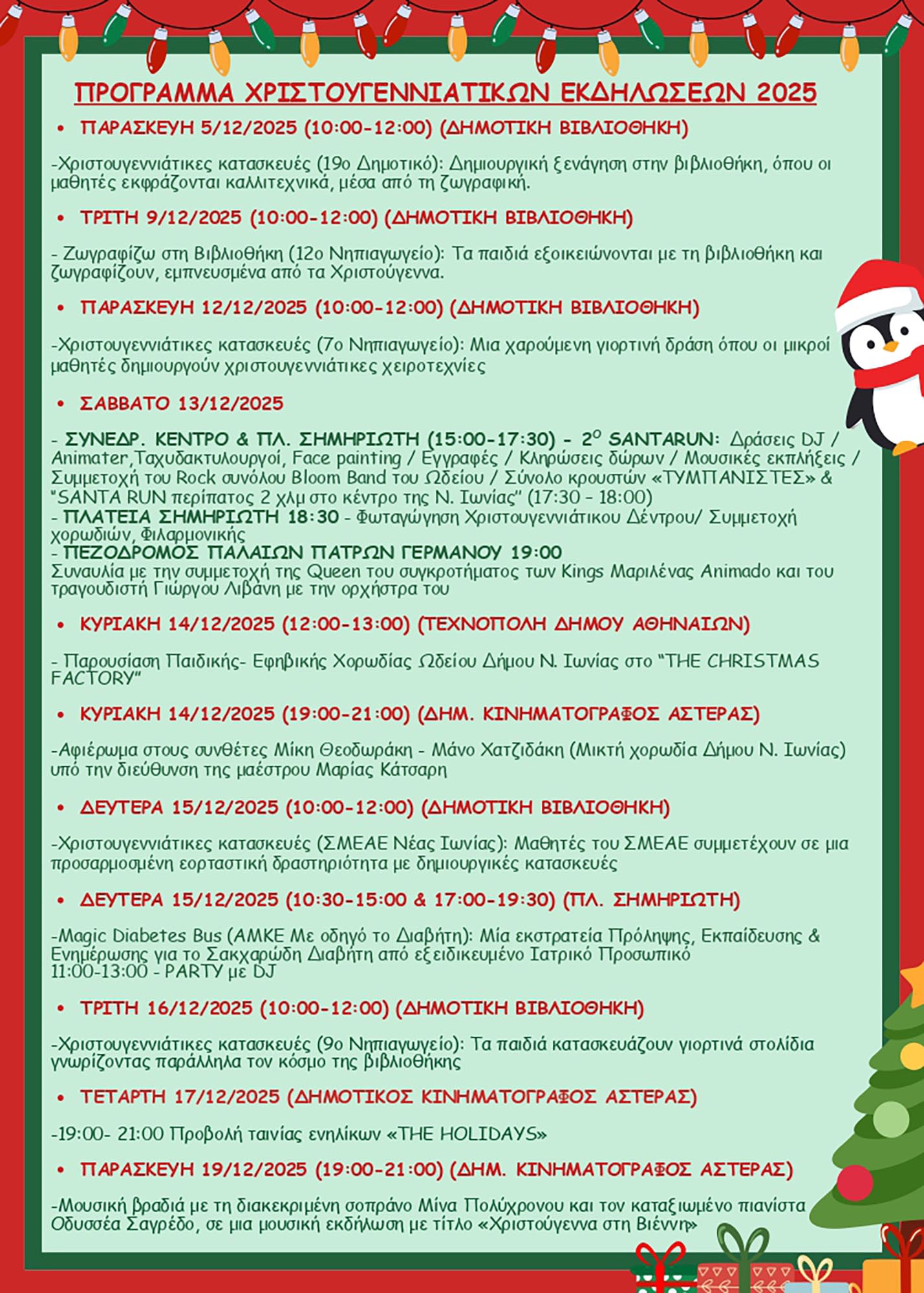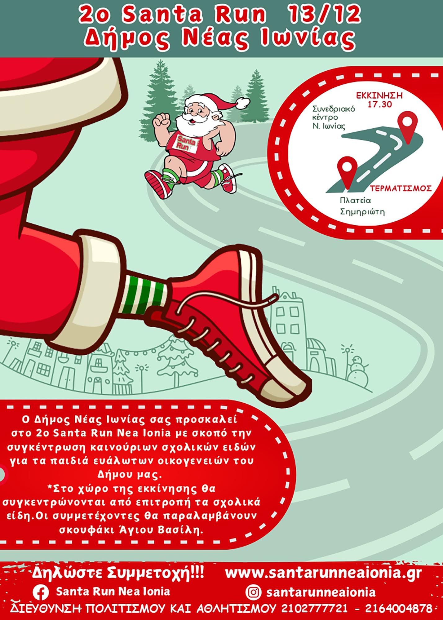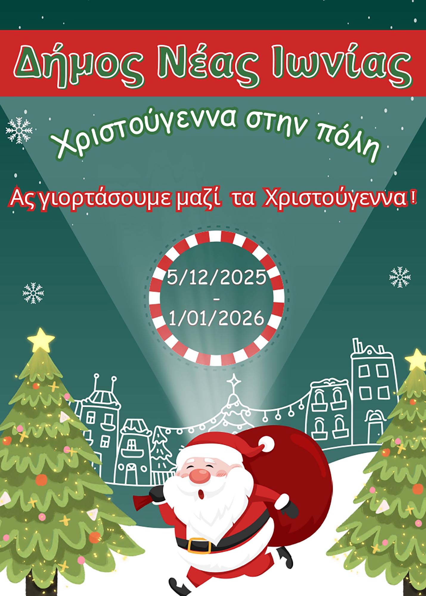 Καταρχάς ο Δήμος Νέας Ιωνίας προσκαλεί στην εκδήλωση για τη φωταγώγηση του Χριστουγεννιάτικου δέντρου, το Σάββατο 13 Δεκεμβρίου και λίγο νωρίτερα πραγματοποιεί και το 2ο Santa Run.