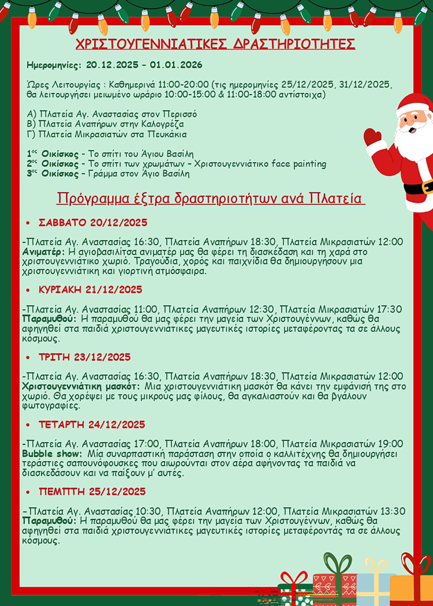 Ο Άγιος Βασίλης και τα ξωτικά του ανοίγουν τις πύλες της αγαπημένης τους πόλης και προσκαλούν το κοινό να περιπλανηθεί στα φωτισμένα στενά της, να συμμετάσχει στα πιο ευφάνταστα εργαστήρια, να παρακολουθήσει τη φετινή θεατρική παράσταση και να ανακαλύψει δεκάδες νέες εμπειρίες που γεμίζουν τη μέρα με φως, δημιουργία και έμπνευση.