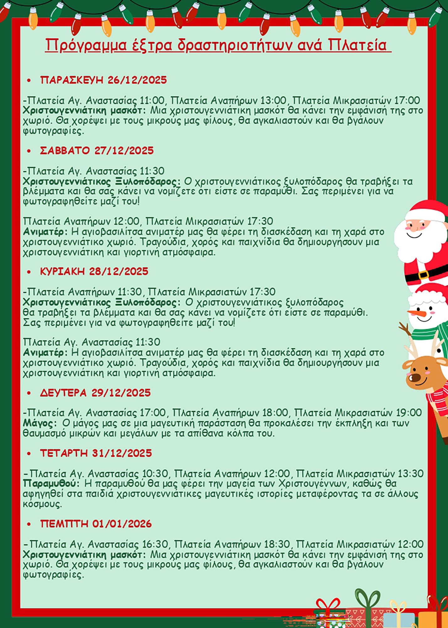 - Το Ξωτικοδημοτικό Σχολείο: Ένα παραμύθι που παίζεται ζωντανά, με τα παιδιά να βοηθούν τα ξωτικά να ξαναβρούν το φως του Χριστουγεννιάτικου Αστεριού.