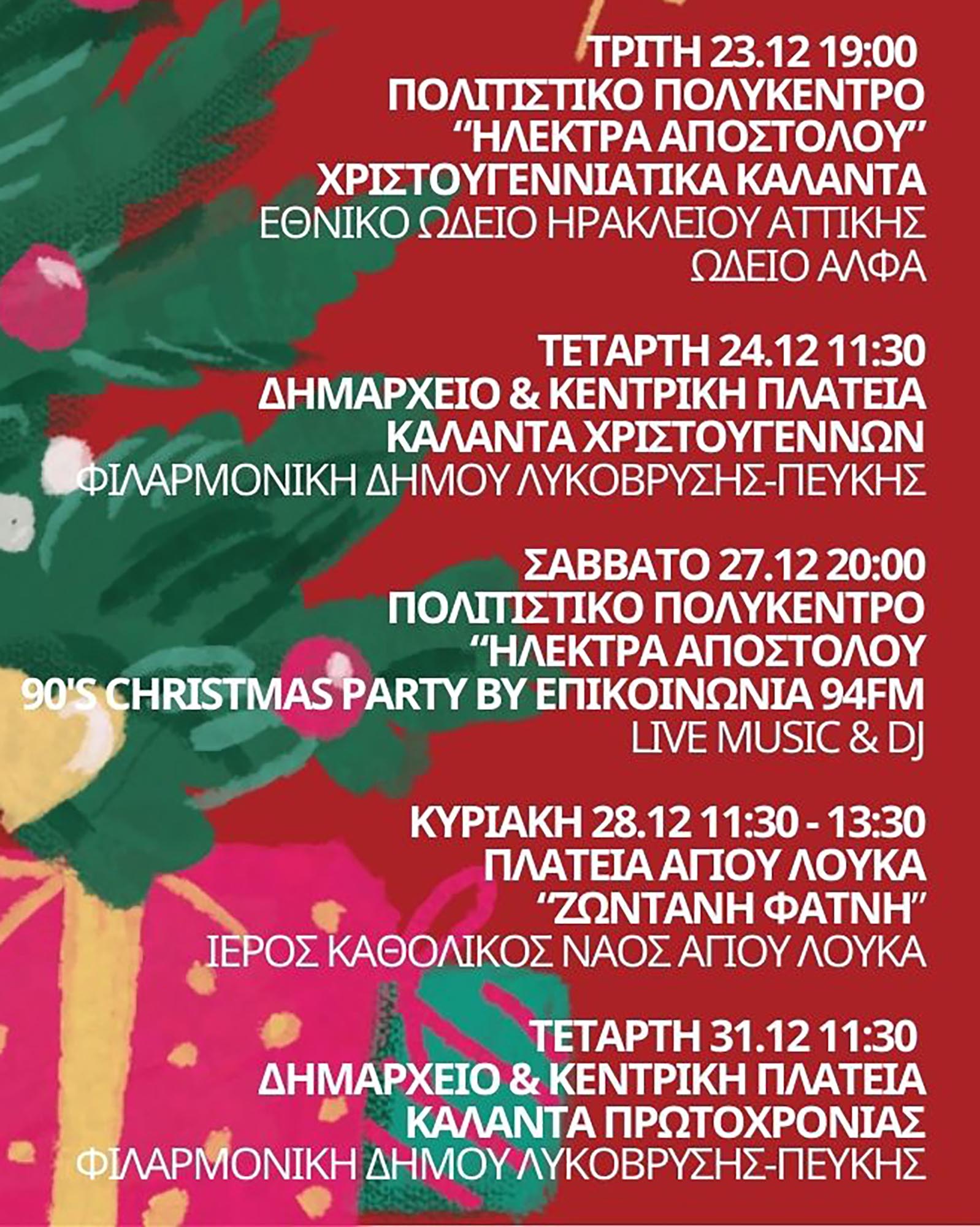 Οι εκδηλώσεις για τις γιορτές έχουν ξεκινήσει ήδη εδώ και, περίπου, μία εβδομάδα, ωστόσο υπάρχουν ακόμη πολλές που μπορείτε να χαρείτε. Πάμε να δούμε τι έχουν ανακοινώσει οι Δήμοι της περιοχής μας, δηλαδή Ηράκλειο Αττικής και Νέα Ιωνία, αλλά φυσικά σε επίπεδο Αττικής η Περιφέρεια, καθώς και στο κέντρο της πρωτεύουσα ο Δήμος Αθηναίων.