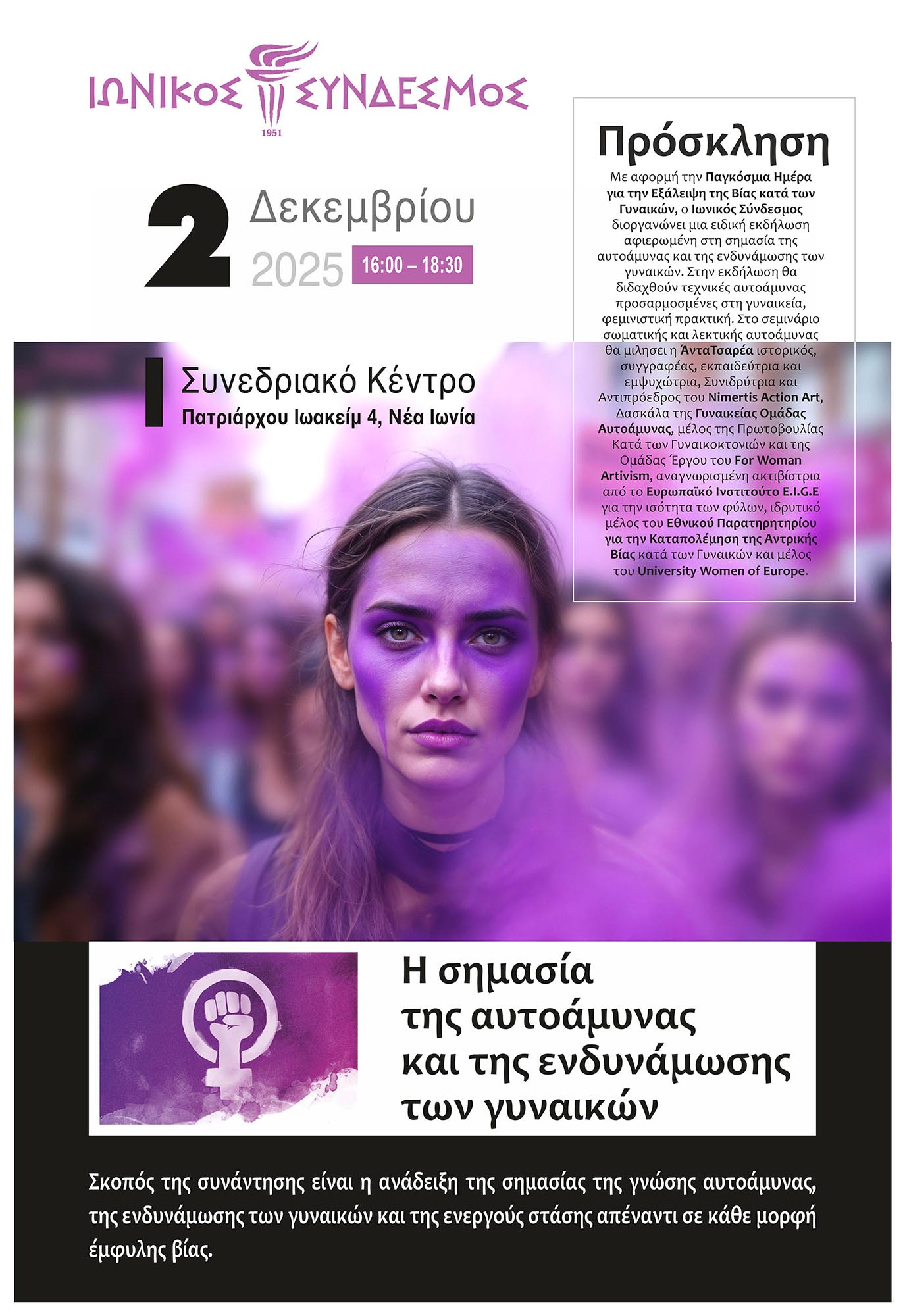 Με αφορμή την Παγκόσμια Ημέρα για την Εξάλειψη της Βίας κατά των Γυναικών, ο Ιωνικός Σύνδεσμος διοργανώνει μια ειδική εκδήλωση αφιερωμένη στη σημασία της αυτοάμυνας και της ενδυνάμωσης των γυναικών.