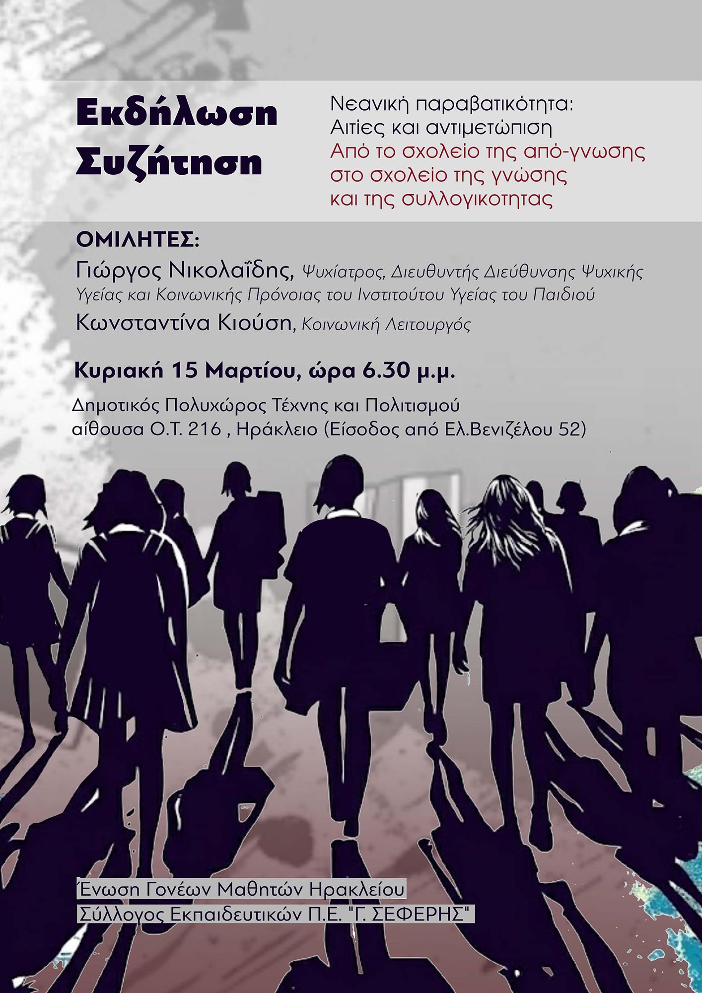 Η Ένωση Γονέων Μαθητών Ηρακλείου Αττικής και ο Σύλλογος Εκπαιδευτικών Πρωτοβάθμιας Εκπαίδευσης ΣΕΠΕ “Γ. Σεφέρης” σας καλούμε σε εκδήλωση με θέμα “Νεανική παραβατικότητα, αιτίες και αντιμετώπιση. Από το σχολείο της από-γνωσης στο σχολείο της γνώσης και της συλλογικότητας” με ομιλητές: