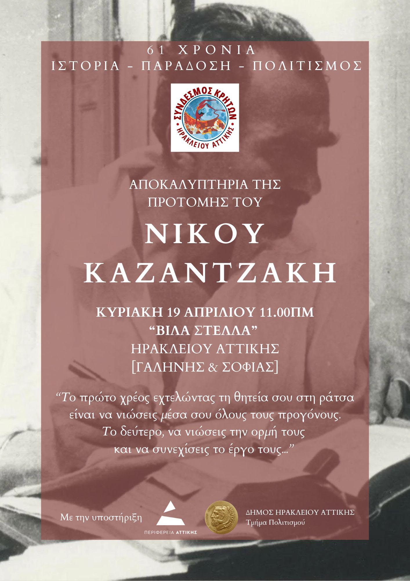 Μια νέα προτομή του Νίκου Καζαντζάκη θα κοσμεί από την Κυριακή 19 Απριλίου, το πολιτιστικό κέντρο του Δήμου Ηρακλείου Αττικής, Βίλα Στέλλα. Ο Σύνδεσμος Κρητών της πόλης, με την υποστήριξη του Δήμου Ηρακλείου Αττικής, πραγματοποιεί τα αποκαλυπτήρια της προτομής του μεγάλου Έλληνα λογοτέχνη την Κυριακή 19 Απριλίου στις 11.00 το πρωί στην αυλή της Βίλα Στέλλα (Γαλήνης και Σοφίας) σε μια εκδήλωση – αφιέρωμα στο Νίκο Καζαντζάκη που θα συνοδευτεί από κρητικά κεράσματα. Την πρωτοβουλία ενίσχυσαν επίσης η Περιφέρεια Αττικής και η Παγκρήτιος Ένωση.