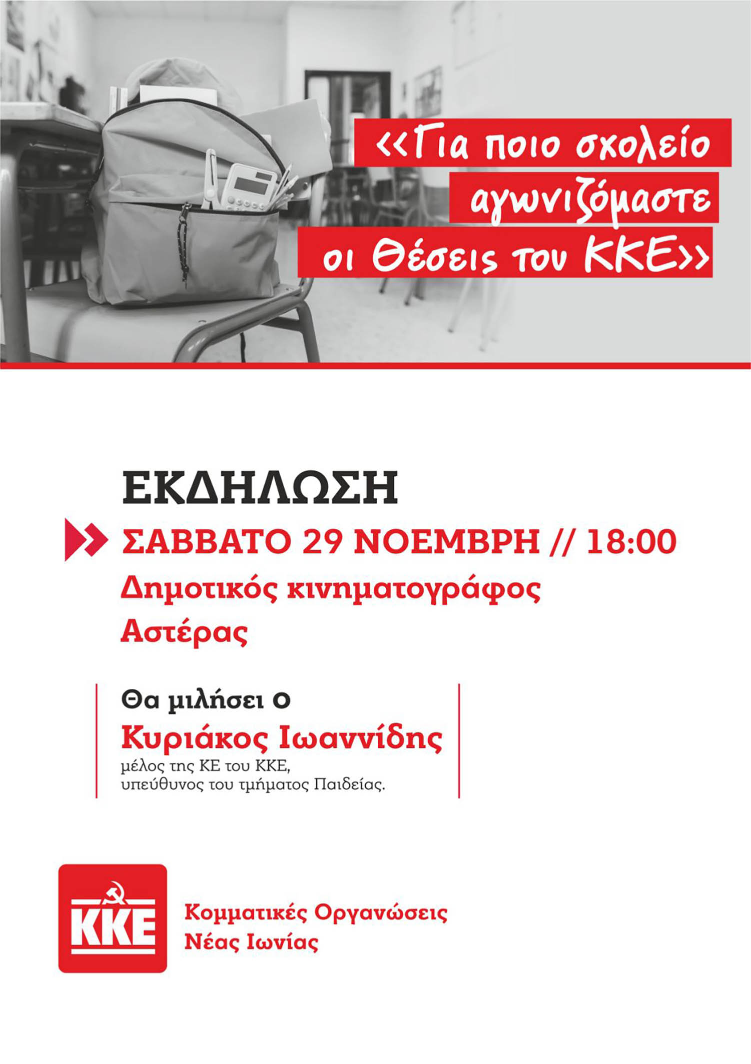 Οι Κομματικές Οργανώσεις του ΚΚΕ στην Νέα Ιωνία, καλούν τον λαό της περιοχής στην εκδήλωση συζήτηση για το κρίσιμο θέμα “Για ποιο σχολείο αγωνιζόμαστε – Οι θέσεις του ΚΚΕ”. Σάββατο 29 Νοέμβρη, 18:00, στον Δημοτικό Κινηματογράφο “Αστέρας”. Στην εκδήλωση θα μιλήσει ο Κυριάκος Ιωαννίδης, μέλος της ΚΕ του ΚΚΕ και Υπεύθυνος του Τμήματος Παιδείας της ΚΕ του ΚΚΕ, ενώ θα ακολουθήσει συζήτηση.