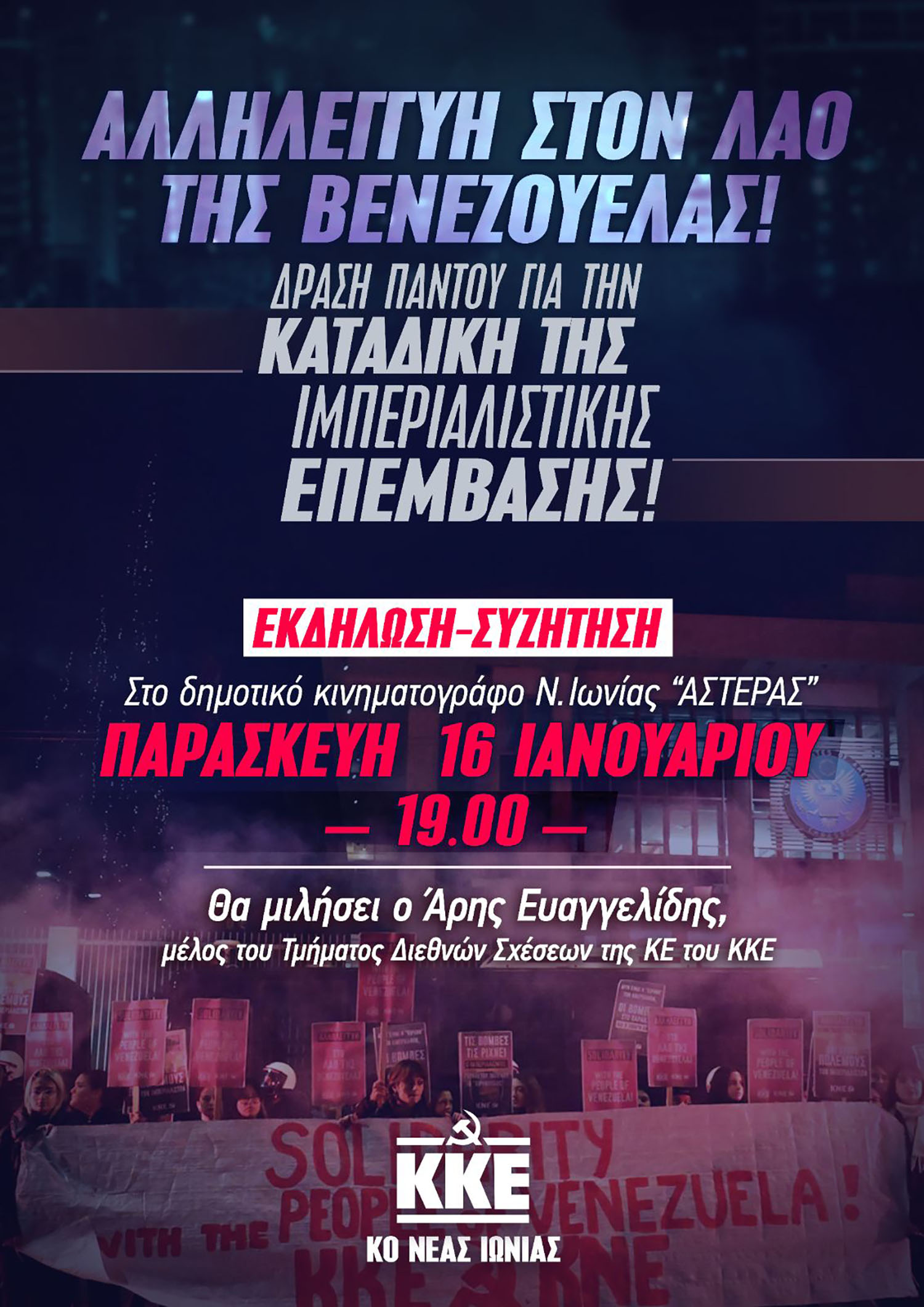 Εκδήλωση-συζήτηση διοργανώνουν της Παρασκευή 16 Ιανουαρίου στις 7 το απόγευμα, στον δημοτικό κινηματογράφο “Αστέρα”, Ασκληπιού 4, πίσω από την πλατεία Σημηριώτη, οι Κομματικές Οργανώσεις Βάσης Νέας Ιωνίας του Κ.Κ.Ε., με αφορμή την επέμβαση των ΗΠΑ στη Βενεζουέλα. Θα μιλήσει ο Άρης Ευαγγελίδης, μέλος του Τμήματος Διεθνών Σχέσεων της Κ.Ε. του Κ.Κ.Ε.