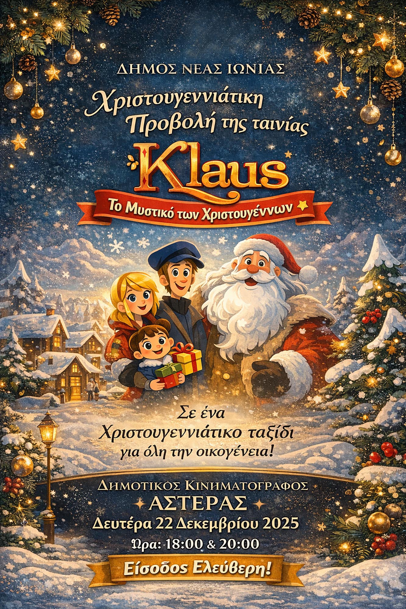 Ο Δήμος Νέας Ιωνίας προσκαλεί μικρούς και μεγάλους σε μια χριστουγεννιάτικη κινηματογραφική βραδιά , την Δευτέρα 22 Δεκεμβρίου, στις 6:00 μμ στον Δημοτικό Κινηματογράφο “Αστέρας”, που θα προβληθεί η αγαπημένη ταινία κινουμένων σχεδίων «Klaus: Το Μυστικό των Χριστουγέννων», μια τρυφερή ιστορία για τη φιλία, την καλοσύνη και τη χαρά της προσφοράς.