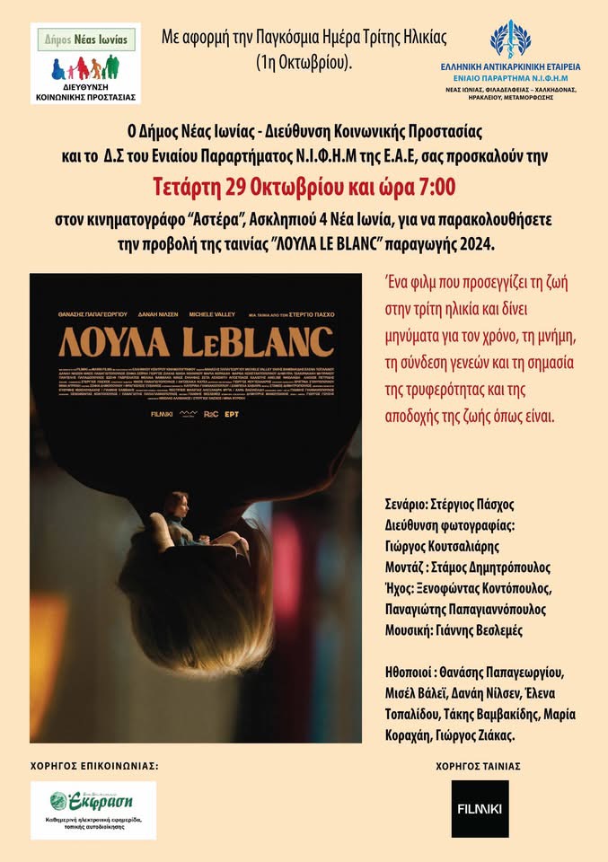 Ο Δήμος Νέας Ιωνίας (Διεύθυνση Κοινωνικής Προστασίας) και το Δ.Σ. του Ενιαίου Παραρτήματος Ν.Ι.Φ.Η.Μ της Ε.Α.Ε. σας προσκαλούν την Τετάρτη 29 Οκτωβρίου και ώρα 7:00 στον κινηματογράφο “Αστέρας”, Ασκληπιού 4 Νέα Ιωνία, για να παρακολουθήσετε την προβολή της ταινίας “ΛΟΥΛΑ LE BLANC”, παραγωγής 2024.