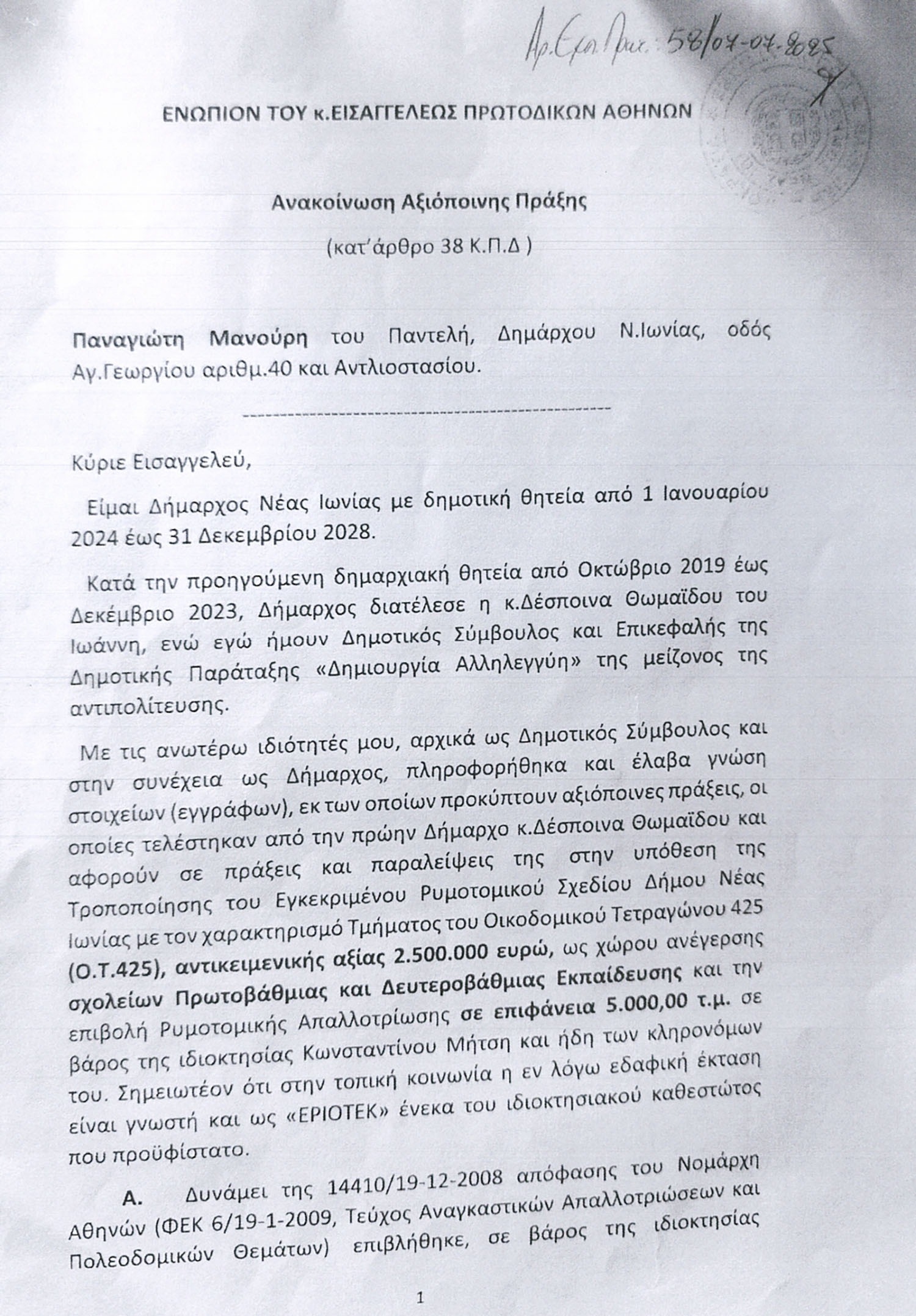 Ο Δήμαρχος Νέας Ιωνίας κατέληξε λέγοντας πως κατέθεσε τον φάκελο στον Εισαγγελέα για τη διερεύνηση αξιόποινης πράξης. «Εγώ δεν λέω, μπορεί να μην είναι δόλος. Είναι σίγουρα αμέλεια. Γιατί ο άλλος έρχεται να σου θυμίσει ότι επί 3-4 χρόνια κοιμάσαι. Κοιμάσαι. Και έρχεται ο άλλος τον Φλεβάρη και σου λέει άρση απαλλοτρίωσης. Πρέπει να σημάνουν οι καμπάνες της Αγιάς Σοφιάς. Ότι το χάνεις σε 6 μήνες. Και αυτούς τους 6 μήνες βρίσκεσαι μαζί, μόνο και μόνο για να πάρεις μία δωρεά να κάνεις παιδική χαρά στο Παναιτώλιο… …υπήρξαν τουλάχιστον 10-15 παρεμβάσεις την Άνοιξη του 2023, πρόσεξε, προσέξτε, τελειώνουμε και ακούγαμε “τι είναι αυτά που λέτε” και “τι είναι αυτά που λέτε”», είπε χαρακτηριστικά, συμπληρώνοντας πως όλα αυτά δείχνουν πως «κάτι δεν πάει καλά… …ο κάθε κατεργάρης στον πάγκο του».