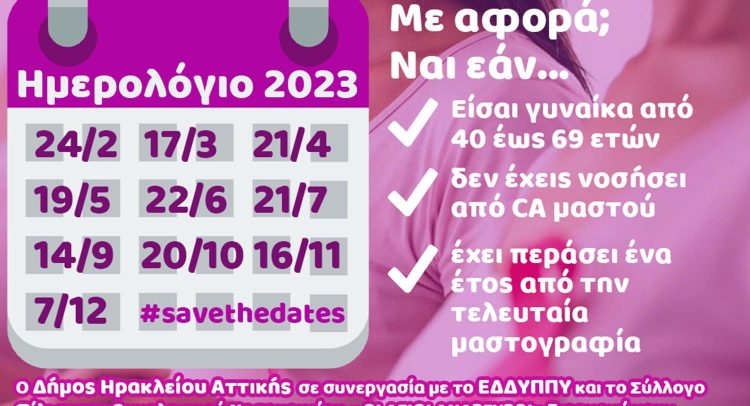 Για ακόμα μια χρονιά ο Δήμος Ηρακλείου Αττικής σε συνεργασία με το Εθνικό Διαδημοτικό Δίκτυο Υγειών Πόλεων, υλοποιούν πρόγραμμα εξετάσεων ψηφιακής μαστογραφίας για όσες κατοίκους της πόλης επιθυμούν να συμμετάσχουν στο πλαίσιο των δράσεων για την πρόληψη και την προαγωγή της Υγείας. Η εξέταση Μαρτίου είναι προγραμματισμένη για τις 17 του μηνός στις 9.00 το πρωί στο Κέντρο Μαστού (Τίρυνθος 2, Άνω Πατήσια). Οι ενδιαφερόμενες μπορούν να δηλώνουν συμμετοχή έως και την Παρασκευή 10/3 το μεσημέρι με ένα τηλέφωνο στη Διεύθυνσης Κοινωνικής Πολιτικής του Δήμου, στα Δημοτικά Ιατρεία 2132000196.