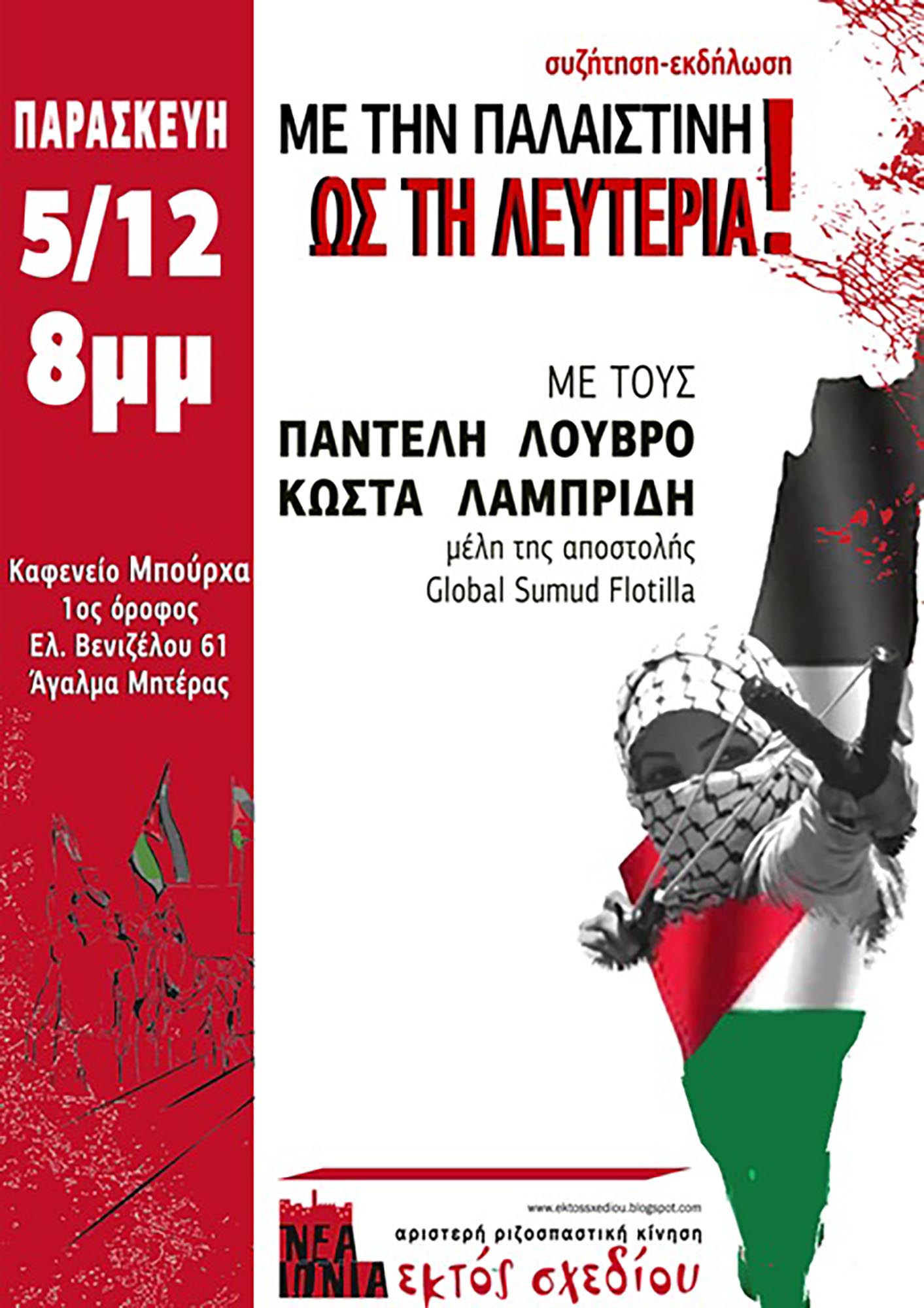 Σε μια εποχή γενοκτονίας και ιμπεριαλιστικής βαρβαρότητας, οι λαοί υψώνουν τη φωνή τους δίπλα στον παλαιστινιακό λαό, απέναντι στη συνεχιζόμενη σφαγή που πραγματοποιεί το κράτος του Ισραήλ με την κάλυψη ΗΠΑ–ΕΕ και της ελληνικής κυβέρνησης.