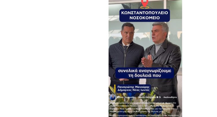 Τις προηγούμενες μέρες βρέθηκε στο Νοσοκομείο «Αγ. Όλγα» η γνωστή κυβερνητική κουστωδία, μαζί με τοπικά στελέχη της ΝΔ και της διοίκησης του Δήμου Ν. Ιωνίας. Στο πλαίσιο εκδήλωσης, ο δήμαρχος Ν. Ιωνίας, Π. Μανούρης, έκανε την ακόλουθη δήλωση: «…Να πω ένα μεγάλο ευχαριστώ στον Υπουργό (σ.σ. Άδωνι Γεωργιάδη), γιατί η αλήθεια είναι ότι είμαστε τυχεροί… Κύριε Υπουργέ ευχαριστούμε πάρα πολύ, γιατί τα βήματα που γίνονται στον χώρο της υγείας είναι βήματα, τα οποία έχουν δείκτες ποσοτικούς και ποιοτικούς».
