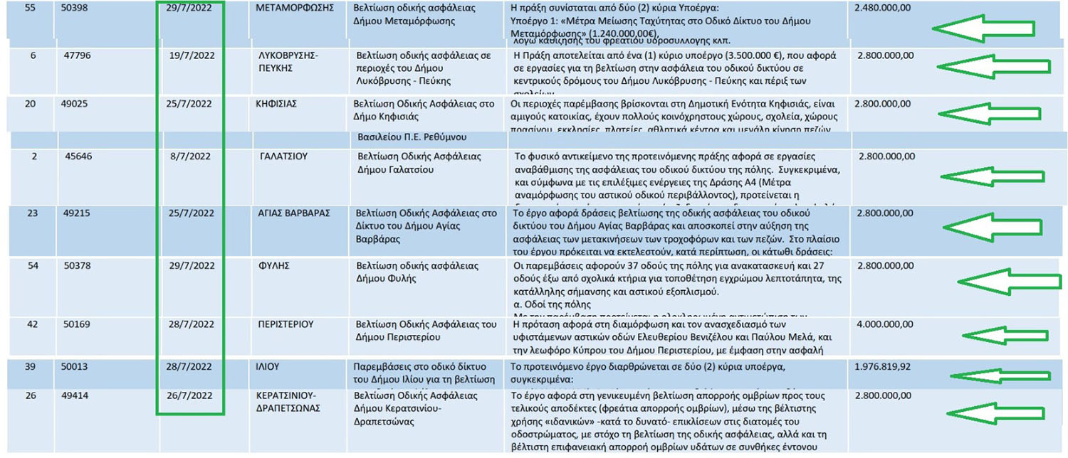 Ωστόσο, τέτοιες παρεμβάσεις, δηλαδή συντηρήσεις οδών και κατασκευή πεζοδρομίων, περιλαμβάνονται σε έργα που έχουν ευρύτερη διάσταση, π.χ. συνολικές παρεμβάσεις για βελτίωση ασφάλειας οδικού δικτύου. Δηλαδή, όπως φαίνεται, δεν μπορούσε να υπάρξει μία δράση, π.χ. ασφαλτοστρώνω όλη τη λεωφόρο Ηρακλείου, τη λεωφόρο Βυζαντίου ή φτιάχνω όλα τα πεζοδρόμια εκεί κ.τ.λ..