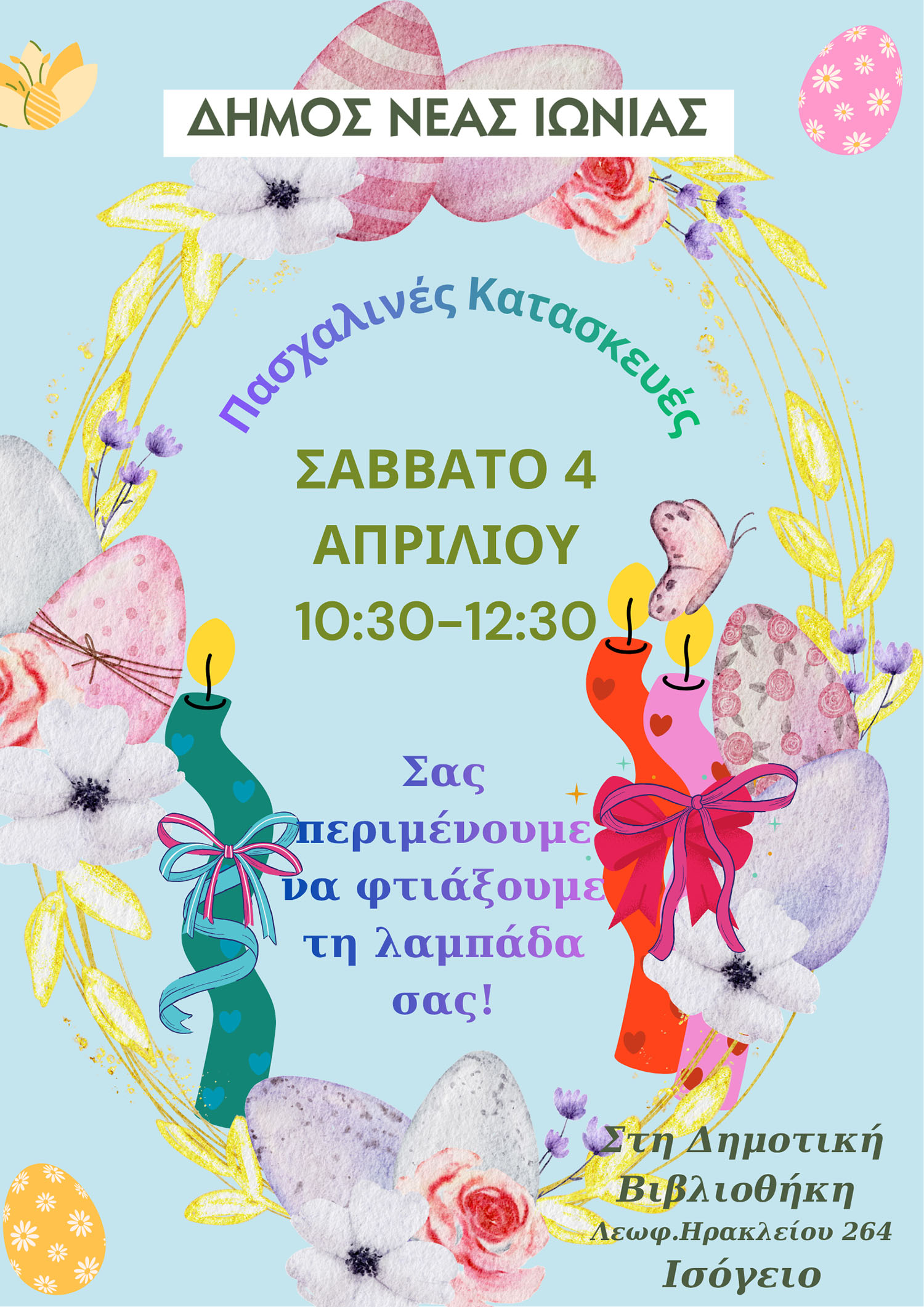 Το Σάββατο 4 Απριλίου, από τις 10:30 έως τις 12:30, στο ισόγειο της Δημοτικής Βιβλιοθήκης (Λεωφ. Ηρακλείου 264), σας περιμένουμε για να δημιουργήσουμε μαζί μοναδικές πασχαλινές κατασκευές.