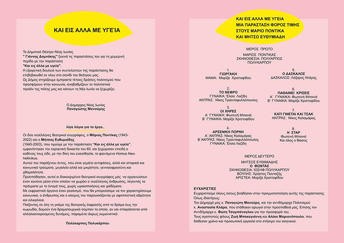 Οι δύο νεοέλληνες θεατρικοί συγγράφεις, ο Μάριος Ποντίκας (1943- 2022) και ο Μήτσος Ευθυμιάδης (1945-2003), που τιμούμε με την παράσταση “Και εις άλλα με υγεία”, εμφανίστηκαν την εκρηκτική δεκαετία του 60, και ξεχώρισαν επειδή ο καθένας τους είδε, με την δίκη του ευαισθησία, το φαινόμενο Homus Neo- hellinikus.