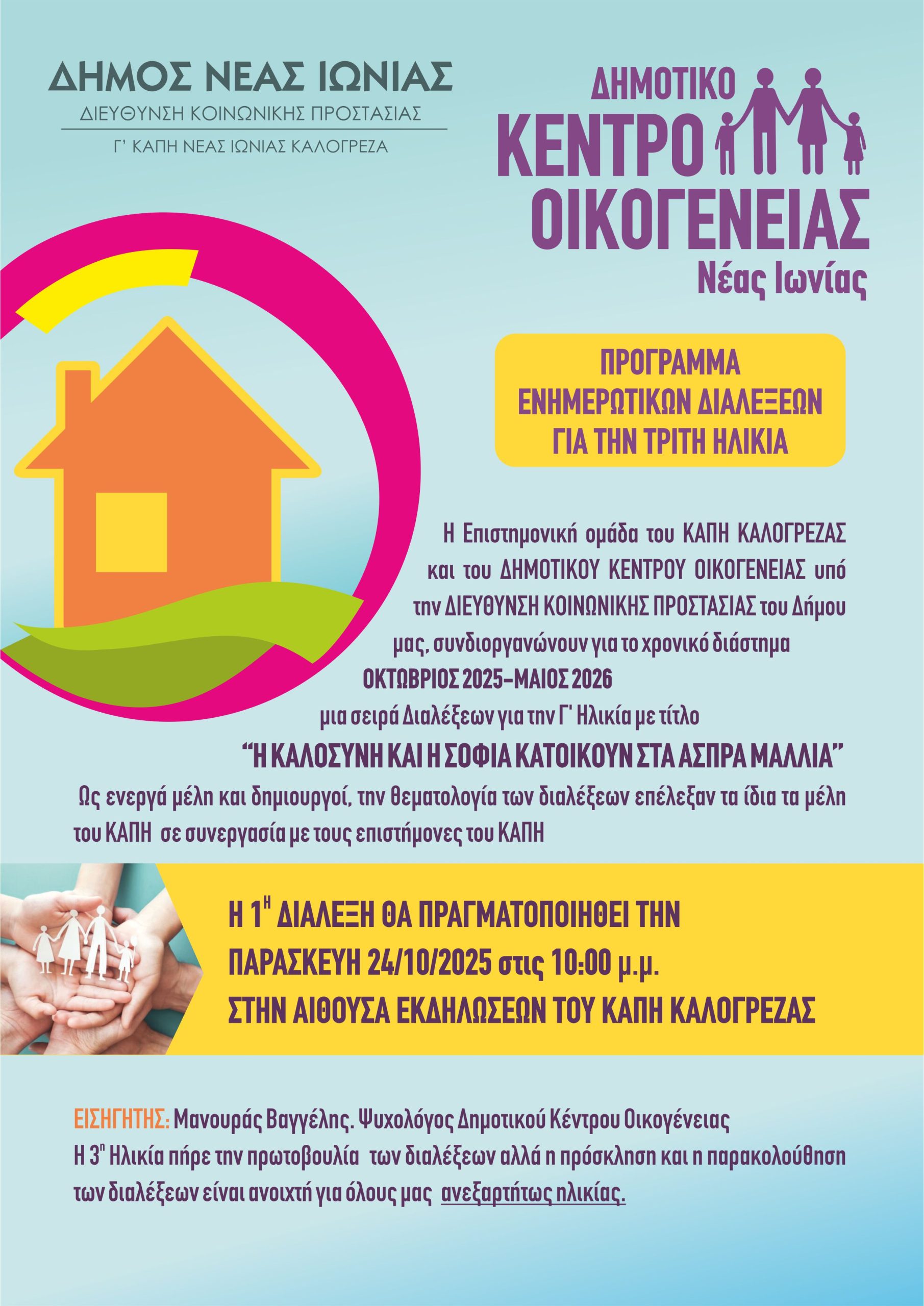 Η Επιστημονική ομάδα του ΚΑΠΗ ΚΑΛΟΓΡΕΖΑΣ και του ΔΗΜΟΤΙΚΟΥ ΚΕΝΤΡΟΥ ΟΙΚΟΓΕΝΕΙΑΣ υπό την ΔΙΕΥΘΥΝΣΗ ΚΟΙΝΩΝΙΚΗΣ ΠΡΟΣΤΑΣΙΑΣ του Δήμου μας, συνδιοργανώνουν για το χρονικό διάστημα ΟΚΤΩΒΡΙΟΣ 2025-ΜΑΙΟΣ 2026 μια σειρά Διαλέξεων για την Γ’ Ηλικία Με τίτλο