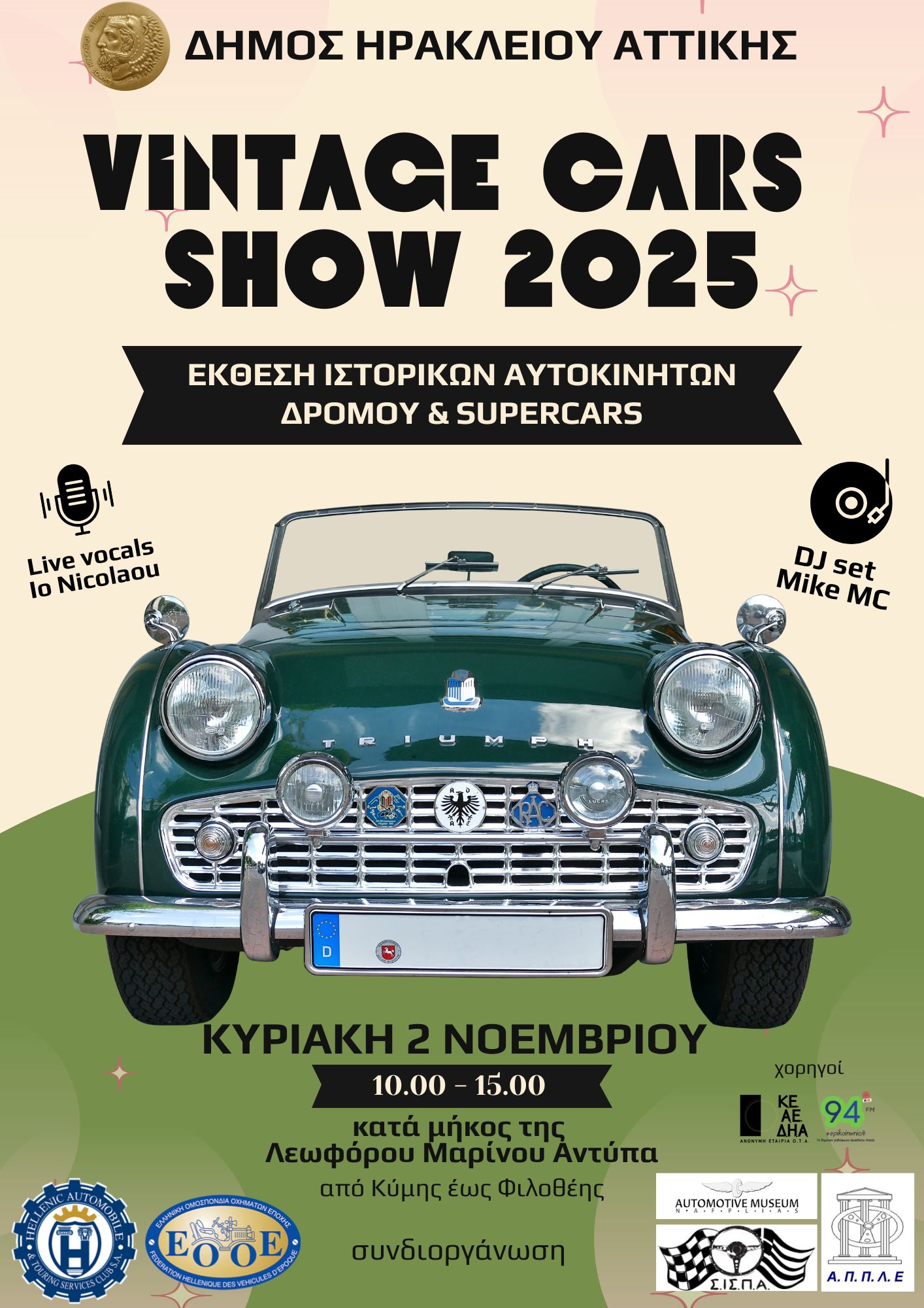 Κλασσικά αυτοκίνητα αντίκες από τις χρυσές δεκαετίες του προηγούμενου αιώνα έρχονται να «παρκάρουν» στον Δήμο Ηρακλείου Αττικής. Την Κυριακή 2 Νοεμβρίου από τις 10.00 το πρωί έως τις 15.00 το μεσημέρι, επί της λεωφόρου Μαρίνου Αντύπα (από Κύμης έως Φιλοθέης) η πόλη φιλοξενεί μια μοναδική έκθεση ιστορικών αυτοκινήτων, φυσικά με ελεύθερη είσοδο για όλες και όλους.