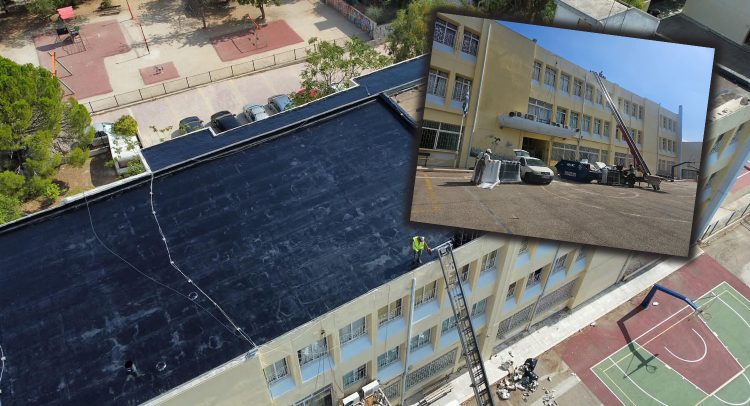 Ήδη το μεγαλύτερο μέρος της επιφάνειας της οροφής της σχολικής μονάδας έχει καλυφθεί με το ειδικό, μονωτικό υλικό, ενώ οι εργασίες συνεχίζονται εντατικά για να ολοκληρωθεί η μόνωση πριν το πρώτο κουδούνι.
