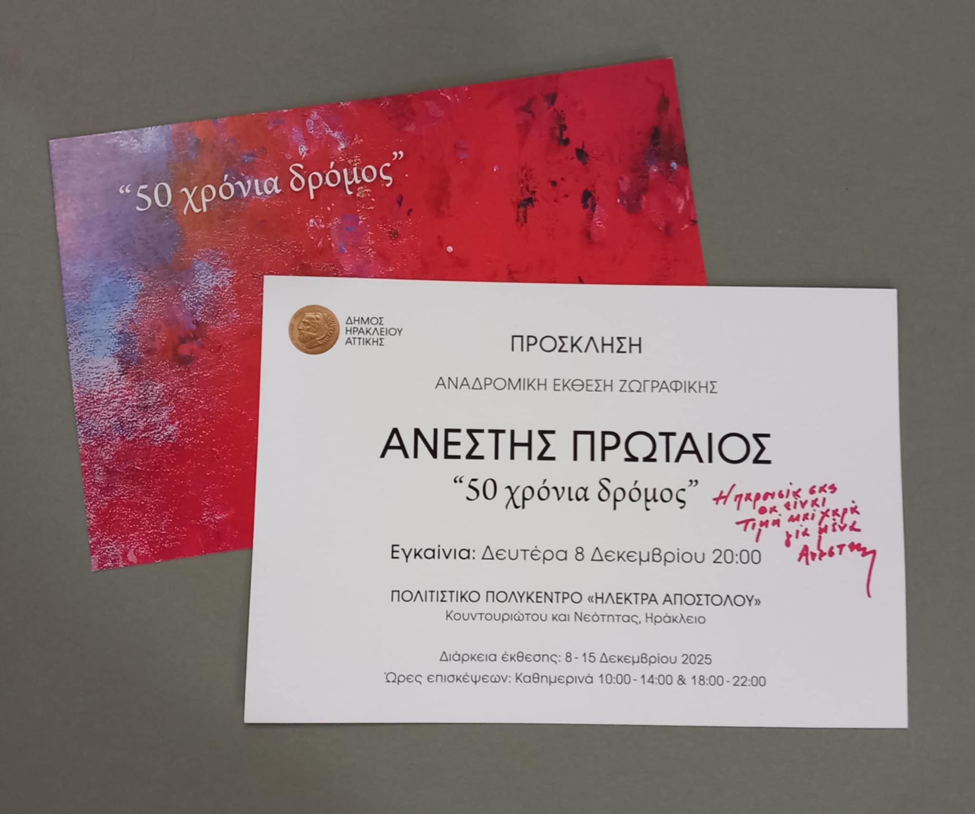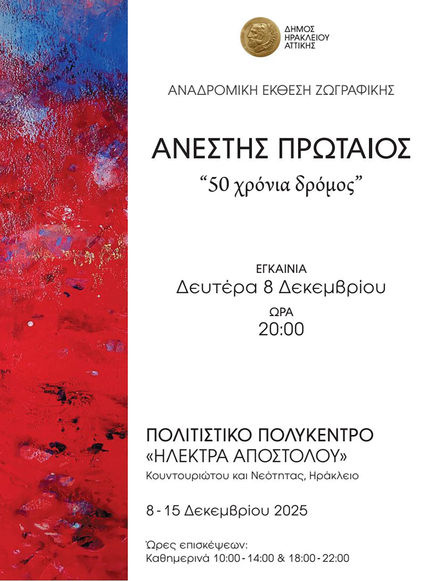 Τα πενήντα χρόνια καλλιτεχνικής του πορείας παρουσιάζει ο εικαστικός Ανέστης Πρωταίος, με την αναδρομική έκθεση ζωγραφικής «Πενήντα χρόνια δρόμος», που θα φιλοξενηθεί στο Πολιτιστικό Πολύκεντρο του Δήμου Ηρακλείου Αττικής, «Ηλέκτρα Αποστόλου» (Κουντουριώτου και Νεότητος) με χορηγό επικοινωνίας την εφημερίδα Αμαρυσία.