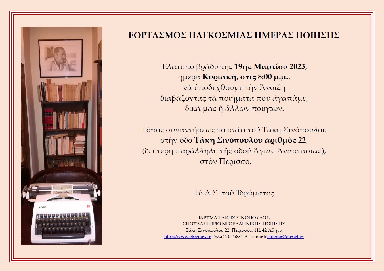 Εορτασμός παγκόσμιας ημέρας ποίησης στο «Τάκης Σινόπουλος», υποδοχή της Άνοιξης, με την ανάγνωση ποιημάτων την Κυριακή 19 Μαρτίου…