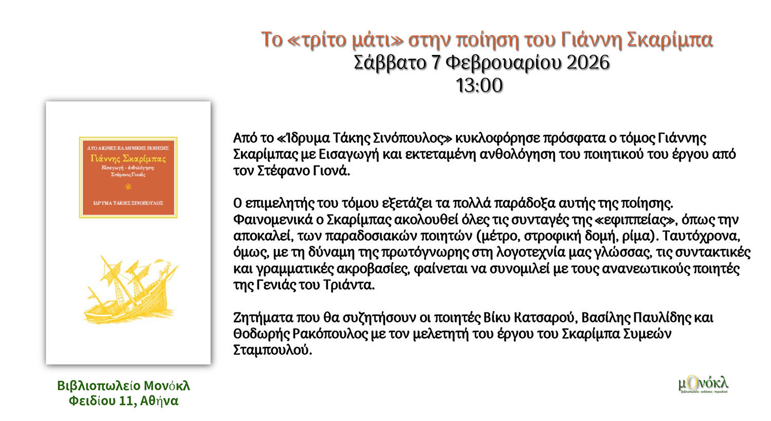 Ζητήματα που θα συζητήσουν οι ποιητές Βίκυ Κατσαρού, Βασίλης Παυλίδης και Θοδωρής Ρακόπουλος με τον μελετητή του έργου του Σκαρίμπα Συμεών Σταμπουλού.