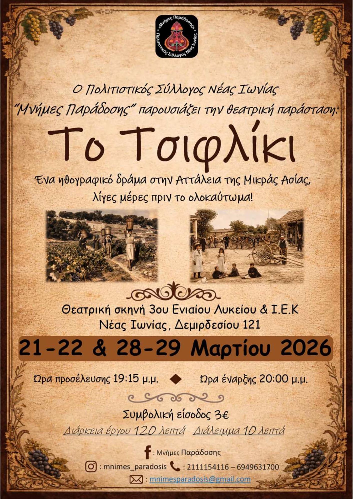 Τη θεατρική παράσταση, με τίτλο “Το τσιφλίκι”, ένα ηθογραφικό δράμα που διαδραματίζεται στην Αττάλεια της Μικράς Ασίας, λίγες ημέρες πριν το ολοκαύτωμα θα παρουσιάσει ο Πολιτιστικός Σύλλογος Νέας Ιωνίας «Μνήμες παράδοσης». Η παράστασή θα παρουσιαστεί στη θεατρική σκηνή του 3ου Ενιαίου Λυκείου & ΙΕΚ Νέας Ιωνίας στις 21 και 22 Μαρτίου, καθώς και στις 28 και 29 Μαρτίου.