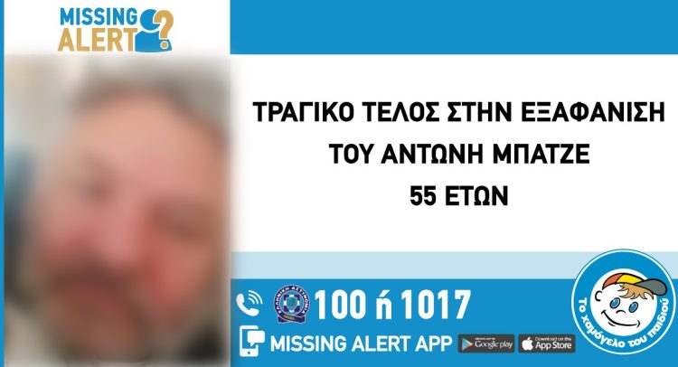 Υπενθυμίζουμε ότι ο Αντώνης Μπατζές, 55 ετών, είχε εξαφανιστεί στις 31/01/2026 από το Ηράκλειο Αττικής. «Το Χαμόγελο του Παιδιού» είχε ενημερωθεί στις 03/02/2026 για την εξαφάνιση του Αντώνη Μπατζέ και είχε προχωρήσει άμεσα στη δημοσιοποίηση των στοιχείων του ενήλικου, κατόπιν αιτήματος της οικογένειάς του, καθώς πιθανόν να συνέτρεχαν λόγοι οι οποίοι έθεταν τη ζωή του σε κίνδυνο.