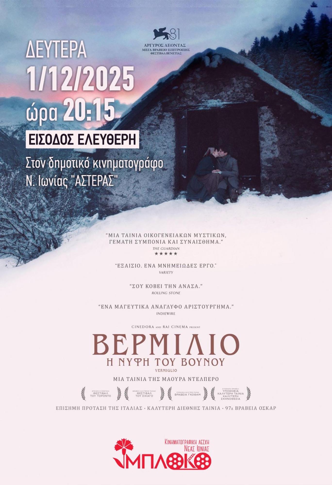 Η κινηματογραφική λέσχη Νέας Ιωνίας μετά την πολύ επιτυχημένη προβολή της ταινίας «Βερμίλιο: Η Νύφη του Βουνού», προχωράει στην επαναπροβολή της τη Δευτέρα 1 Δεκεμβρίου και ώρα 8.15 μ.μ. στο δημοτικό κινηματογράφο Ν. Ιωνίας «ΑΣΤΕΡΑΣ».
