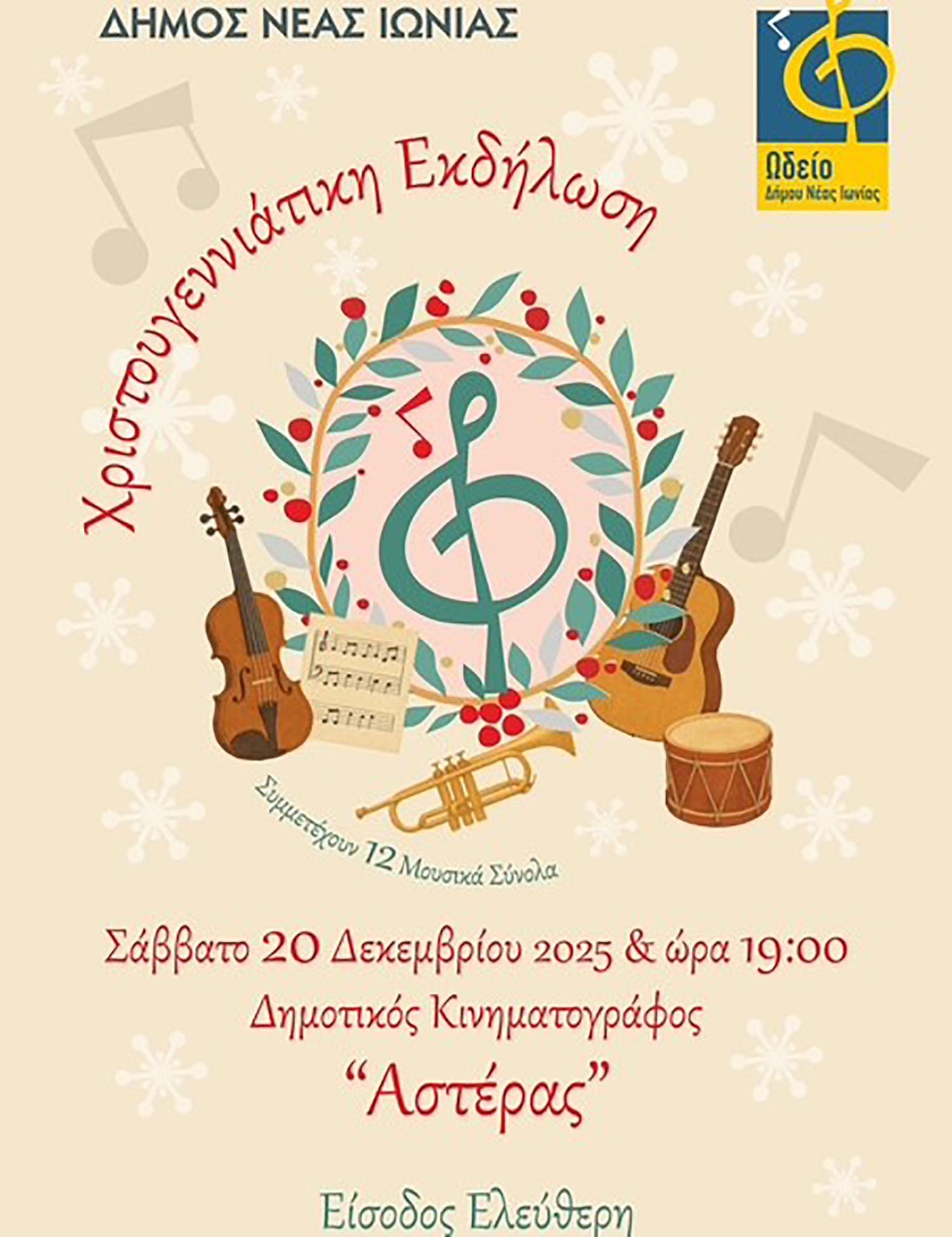 Ο Δήμος Νέας Ιωνίας και το Δημοτικό Ωδείο σας προσκαλούν στη γιορτινή μουσική βραδιά, γεμάτη χριστουγεννιάτικους ρυθμούς και μελωδίες, που θα πραγματοποιηθεί το Σάββατο 20 Δεκεμβρίου, στις 19:00, στον Δημοτικό Κινηματογράφο «Αστέρας».